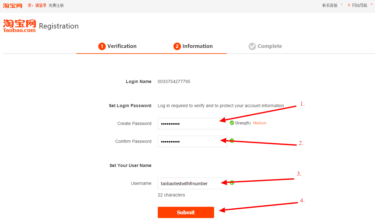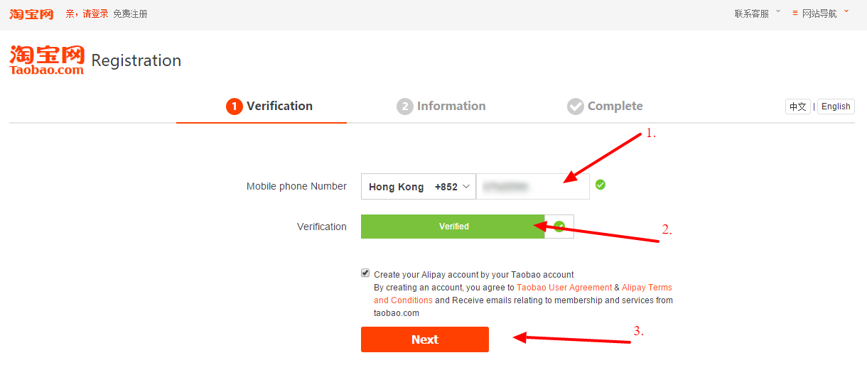 Tady to začíná být trochu dobrodružné. V okamžiku psaní tohoto článku Taobao nepodporuje česká tlf. čísla, to teoreticky znamená, že nebudete moci registraci dokončit. Nezbývá vám tedy nic jiného, než si někde opatřit nějaké číslo z podporovaných zemí. Bohužel to již nejde z Číny, protože čínská vláda aktuálně vyžaduje registraci tlf. čísel na uživatele (i předplacených). Nicméně můžete využít služby Tiptrans nazvané "Nákup v prodejně" a my pro Vás koupíme číslo v Hong Kongu (SIM karta bude následně zařazena do Vašeho účtu a můžete si ji nechat poslat domů). Druhou možností je pořídit si nějaké "virtuální" číslo, podívejte se třeba na tuto stránku, tam najdete přehled webů, které vám umožní pořídit si (i dočasné) tlf. číslo. Některé z nich nefungují (protože je před vámi použilo už více lidí), nicméně osobně jsme vyzkoušeli, že stále se dají najít čísla, která fungují. Nevýhodou sdíleného čísla je to, že číslo je zároveň vaše ID, což není z dlouhodobného hlediska vůbec bezpečné, proto doporučujeme mít výhradně vlastní číslo.